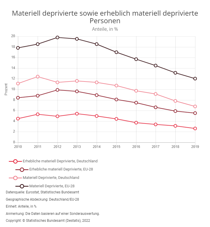 Dieser Indikator zeigt den Anteil an Personen an der Gesamtbevölkerung, die als erheblich materiell depriviert gelten. Erhebliche materielle Deprivation beschreibt den Mangel an bestimmten Gebrauchsgütern und den unfreiwilligen Verzicht auf ausgewählten Konsum aus finanziellen Gründen. Eine erhebliche materielle Entbehrung trifft für alle Menschen zu, deren Haushalt mindestens vier von neun vorgegebenen Kriterien erfüllen, die die finanziellen Einschränkungen des Haushalts widerspiegeln. Die neun Merkmale umfassen im Einzelnen: das Fehlen eines Autos, einer Waschmaschine, eines Farbfernsehgeräts oder eines Telefons im Haushalt (jeweils, weil es sich der Haushalt finanziell nicht leisten kann), ein finanzielles Problem haben, die Miete, die Hypothek oder Rechnungen für Versorgungsleistungen rechtzeitig zu bezahlen, die Wohnung angemessen zu heizen, jeden zweiten Tag Fleisch, Fisch oder eine gleichwertige vegetarische Mahlzeit zu essen, jährlich eine Woche Urlaub außerhalb der eigenen Wohnung zu verbringen oder unerwartete Ausgaben in einer bestimmten Höhe (2019: 1100 Euro) aus eigenen finanziellen Mitteln zu bestreiten. Die Daten stammen aus der europaweit harmonisierten Erhebung „EU-SILC“ (European Union Statistics on Income and Living Conditions), die in Deutschland vom Statistischen Bundesamt unter dem Namen „Leben in Europa“ durchgeführt wird. Dabei geben jährlich etwa 14 000 Privathaushalte in Deutschland auf freifreiwilliger Basis Auskunft zu Einkommens- und Lebensbedingungen.