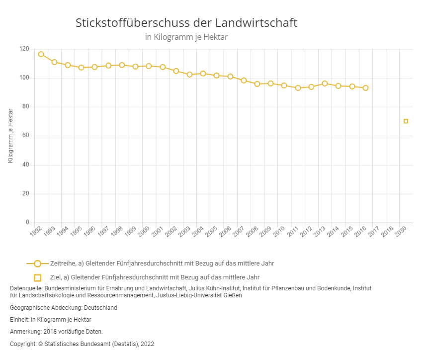 Im Übermaß in die Umwelt eingetragener Stickstoff hat zahlreiche negative Konsequenzen für die Umwelt. Er belastet das Grund- und Oberflächenwasser, Binnengewässer, Meere und Landökosysteme werden übermäßig mit Nährstoffen versorgt, Treibhausgase und Luftschadstoffe entstehen. Im internationalen Vergleich hat Deutschland einen sehr hohen Stickstoffüberschuss. Der Indikator wird von der Deutschen Nachhaltigkeitsstrategie (DNS) verwendet. Der hier dargestellte Indikator und die verwendeten Daten sind von DESTATIS aus dem Jahr 2018.