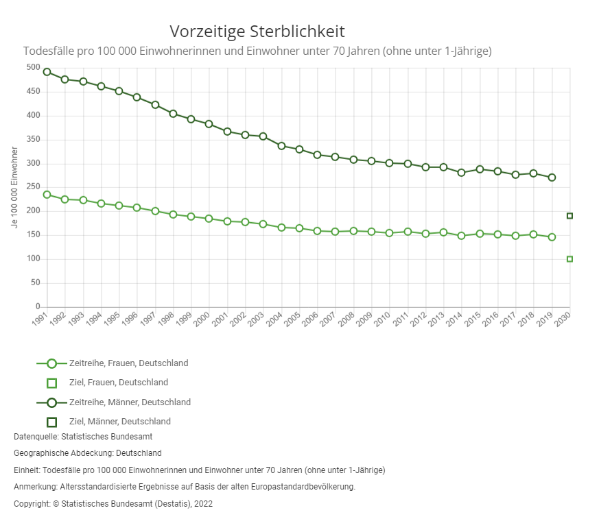 Die Bundesregierung hat sich zum Ziel gesetzt, dass die vorzeitige Sterblichkeit bei Männern bei höchstens 190 je 100 000 Einwohner im Jahr 2030 liegen soll.