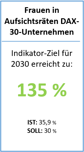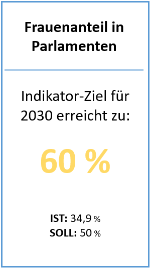 Die Deutsche Nachhaltigkeitsstrategie umfasst fünf Indikatoren und misst vor allen Dingen - aber nicht nur - die ökonomische Komponente über den Verdienstabstand von Frauen zu Männern und die Anzahl von Frauen in Führungspositionen in der Wirtschaft und im öffentlichen Dienst. Auf dieser Grundlage errechnet sich ein Fortschritt von 136,7 Prozent bei SDG 5.