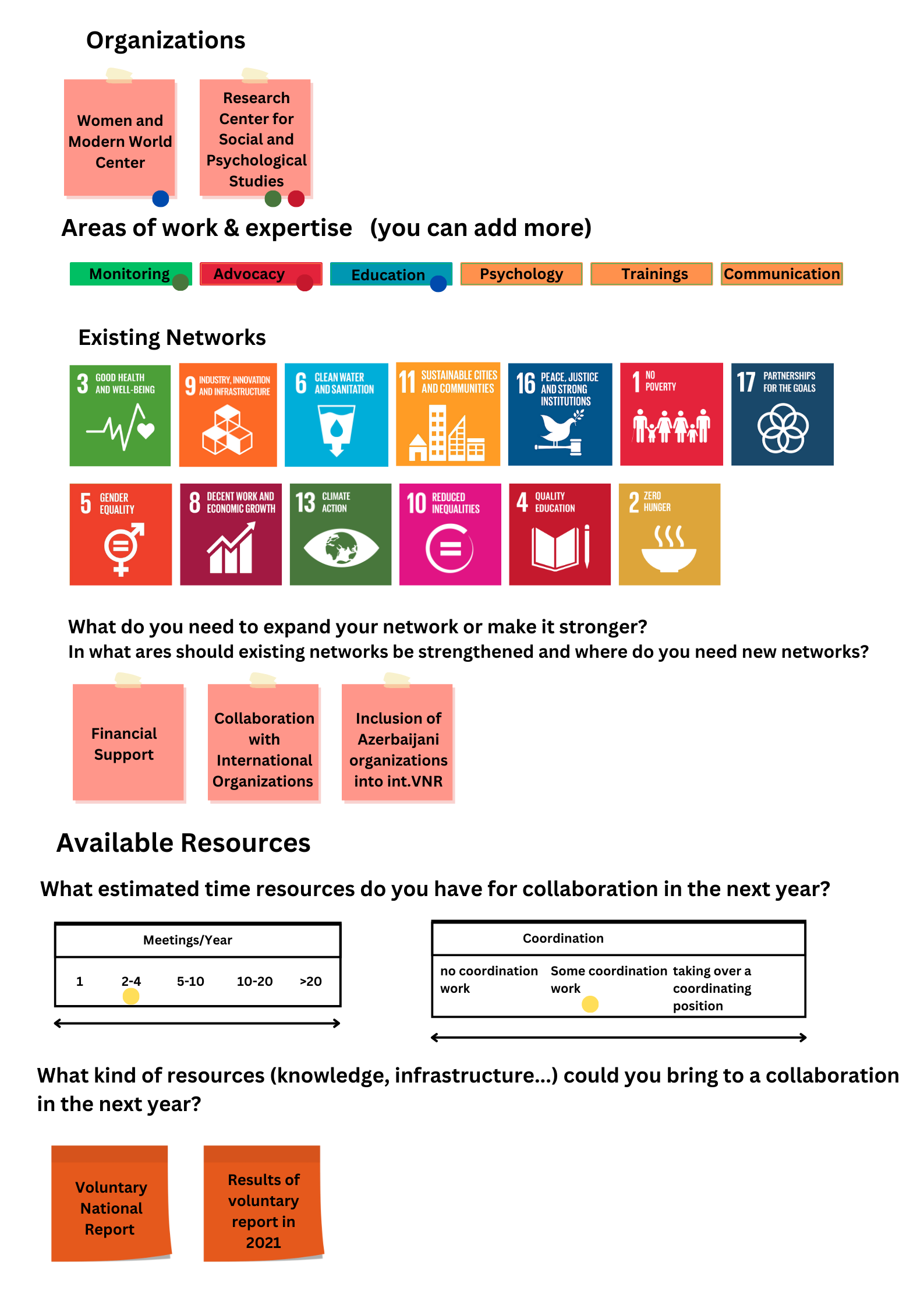 Nach einer Begrüßung und generellen Informationen zum Projekt und zu den bevorstehenden Aktivitäten, startete der Tag mit einem Kennenlernspiel. So konnten sich alle Teilnehmenden auch persönlich vorstellen und das Eis wurde gebrochen. In einer interaktiven Wiederholungssitzung wurden anschließend die bereits in vorherigen Aktivitäten Erlernten Informationen wiederholt und alle Teilnehmenden auf den gleichen Stand gebracht. In einer Gruppenarbeit in Ländergruppen sollten die Teilnehmenden anschließend ein Dokument entwickeln, welches die Verbindungen zwischen ihren Organisationen zeigt, aber auch welche nationalen und internationalen SDG-Netzwerke es gibt und inwiefern sie mit diesen zusammenarbeiten können. Dabei konnten sie auf bereits vorhandene Informationen aus dem online Workshop zum Thema SDG-Netzwerke aufbauen. Das Dokument hilft dabei einen Überblick über Akteure, deren Themenfelder sowie vorhandene Ressourcen und Möglichkeiten zur Kooperation zu erhalten und auf Basis dessen Ideen für Projekte und Aktivitäten zu entwickeln.